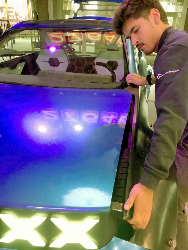 Een uur voor de officiële presentatie, en vlak voordat er een zwart doek overheen wordt gedrapeerd voor de latere onthulling, maken de studenten een rondje met De Ingenieur rond de auto. Die oogt als een moderne Renault 5. Opzet? Sarp schiet in de lach. ‘Dat horen we vaker. Maar nee, dit is echt ons eigen ontwerp. Middenin het jaar waarin wij bezig waren, kwam de elektrische Renault 5 op de markt. Dat was een beetje ongelukkig.’