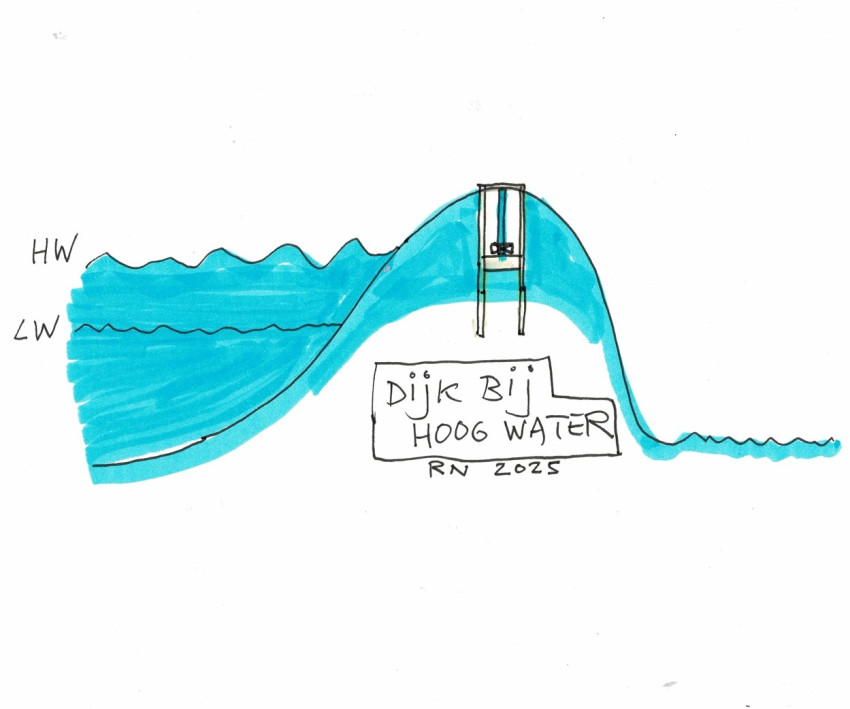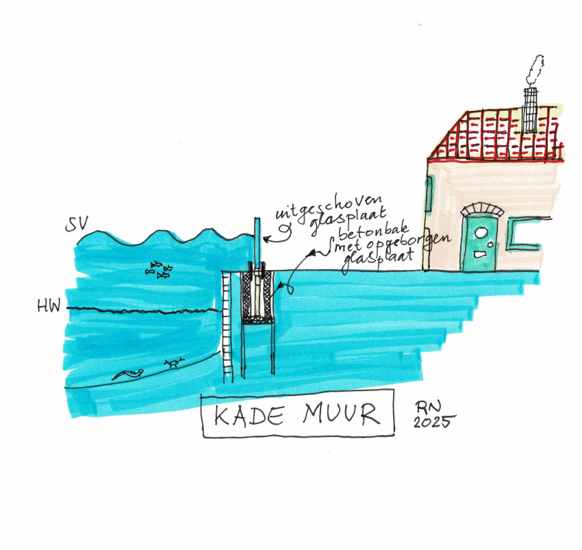 Daarom het voorstel deze dijkversteviging met twee hoofdonderdelen uit te voeren: een ondergrondse bak van duurzaam beton en een bij storm uit de bak omhoogschuivend vlak van veiligheidsglas. Dit moet eeuwen kunnen meegaan bij zorgvuldig onderhoud. De schetsen bovenaan deze pagina’s maken dit idee duidelijk.