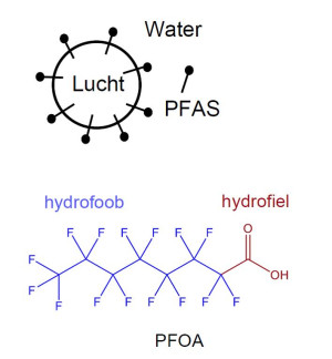 PFAS is een oppervlakte-actieve stof. Het ene deel van het molecuul is hydrofiel en wil graag in het water zitten, het andere deel is juist hydrofoob, ofwel watervrezend.