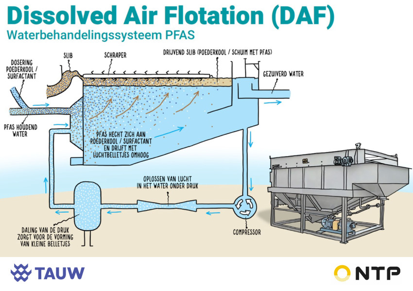 Bij deze nieuwe techniek is een DAF-installatie (dissolved air flotation) als voorzuivering ingezet. Die verwijdert pfas met schuimfractionering doordat pfas zich aan de luchtbelletjes binden. Bij DAF is een specifieke oppervlakte-actieve stof toegevoegd aan het schuim, geselecteerd na experimenten in het lab, om de efficiëntie te vergroten. Door deze voorbehandeling worden de achterliggende filters ontzien. Die bevatten kostbare materialen die de pfas opnemen, zoals actief kool of ionenwisselaarharsen, en hoeven hierdoor minder vaak te worden vervangen.
