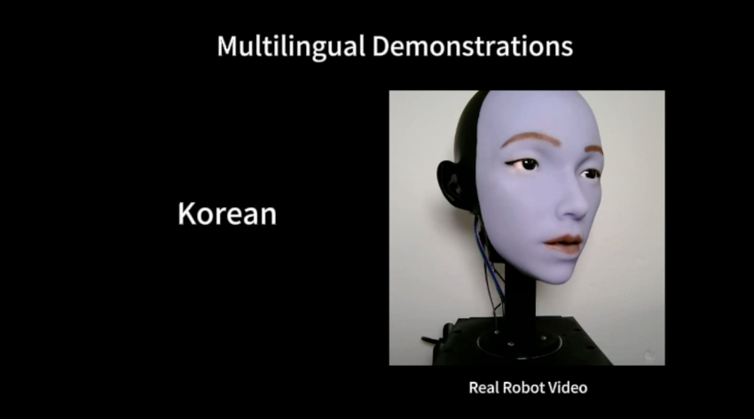 Is de mechanische kant van het verhaal al indrukwekkend, minstens zoveel werk stopte de groep in het natuurgetrouw laten bewegen van de mond bij alle mogelijke klanken. Hiervoor werd een AI-model getraind, net zolang tot bekend is welke bewegingen de motoren moeten maken voor een bepaalde stand van de lippen. Het bijzondere is dat de robot hierdoor alle mogelijke talen kan ’spreken’, zelfs wanneer die geen onderdeel waren van de training, zoals Frans, Chinees en Arabisch.