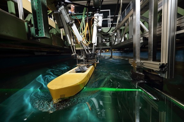 Het is één van de demonstraties die een groepje journalisten op bezoek bij de TU Delft deze middag te zien krijgen. Op 25 september, World Maritime Day, mochten zij rondkijken bij de twee testtanks die het maritieme onderzoekslab rijk is: de flume tank en de sleeptank.