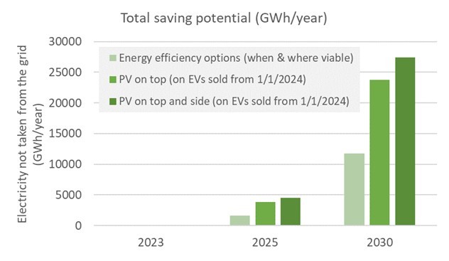 Hoewel het eindrapport er nog niet is, tekenen enkele eerste conclusies zich af. Ten eerste valt er op Europees overkoepelend niveau veel energie te besparen wanneer zonnecellen massaal in voertuigen worden ingebouwd; zie de figuur hieronder. Of het de individuele automobilist of chauffeur een grote besparing oplevert, hangt erg af van diens situatie, zegt Slooff. ‘Wie de elektrische auto alleen gebruikt om af en toe boodschappen te doen, kan een aanzienlijk deel zelf opwekken. Rijd je meestal langere snelwegstukken, dan draagt eigen opwekking wat minder bij, maar nog wel substantieel. De toegevoegde waarde van zonnecellen op elektrische auto’s is duidelijk: minder laadmomenten, kostenbesparing, snellere terugverdientijd.’ Volgens Slooff is het zeker niet zo dat alle elektrische voertuigen met PV moeten worden uitgerust, opdat de consument nog wat te kiezen heeft.