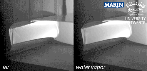 En bij onderzoeksinstituut MARIN lieten ze brekende watergolven tegen een wand slaan, terwijl ze met tientallen druksensoren maten wat er gebeurde. Was er rond de golf lucht, dan verliep de botsing zoals was gedacht, maar wanneer rond de golf waterdamp zat, dan stortte de dampbel onder de golf snel in, vanwege condensatie.
