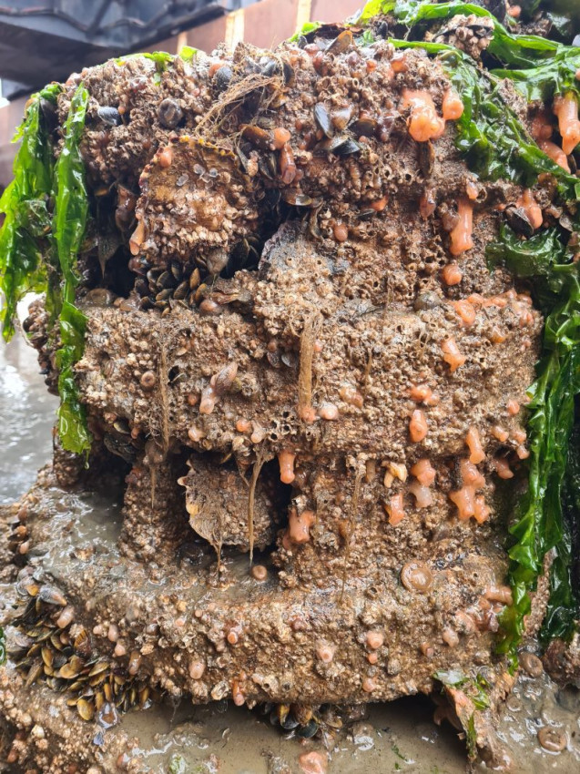 De betonblokken zitten vol mosselen, zeesterren, oesters, anemonen, garnalen, algen, wieren, krabben en – deels jonge – palingen.