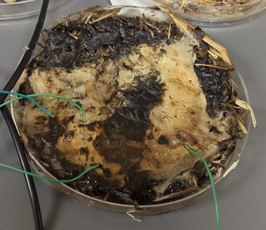 Openingsbeeld: Geheugenschakeling gebouwd van mycelium. Fotoâs: âSustainable memristors from shiitake mycelium for high-frequency bioelectronicsâ, John LaRocco, Qudsia Tahmina, Ruben Petreaca, John Simonis, Justin Hill, PLOS ONE, 2025.