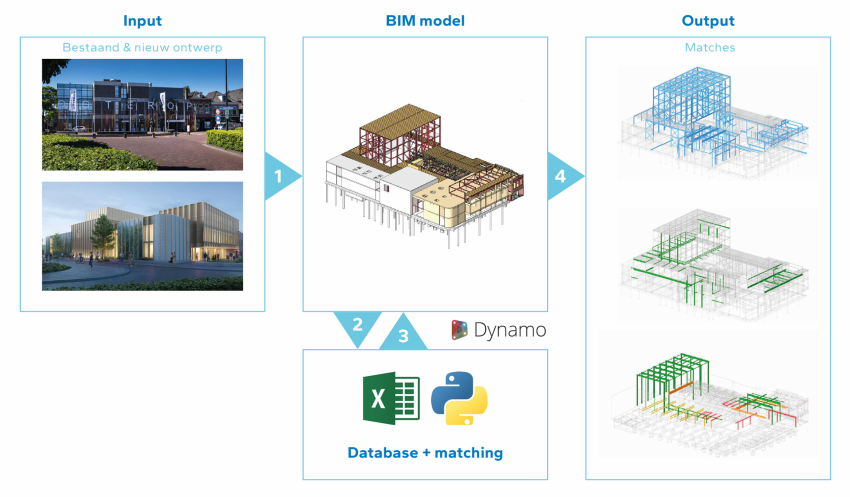 Een van de redenen hiervoor is dat vaak niet bekend is waar staalprofielen die na een verbouwing overblijven, opnieuw kunnen worden gebruikt. Daarin wil bouwtechniekadviseur ABT verandering brengen met het matching algoritme SteelMatch. Dat vergelijkt de eigenschappen van ‘geoogste’ staalprofielen met de eisen van nieuwe ontwerpen, om vervolgens donorstaal te koppelen aan een ontvanger. Indien gewenst kan het algoritme een ontwerp wijzigen om het geschikt te maken voor het beschikbare donorstaal, of om het aantal keren dat het donorstaal moet worden gezaagd te minimaliseren.